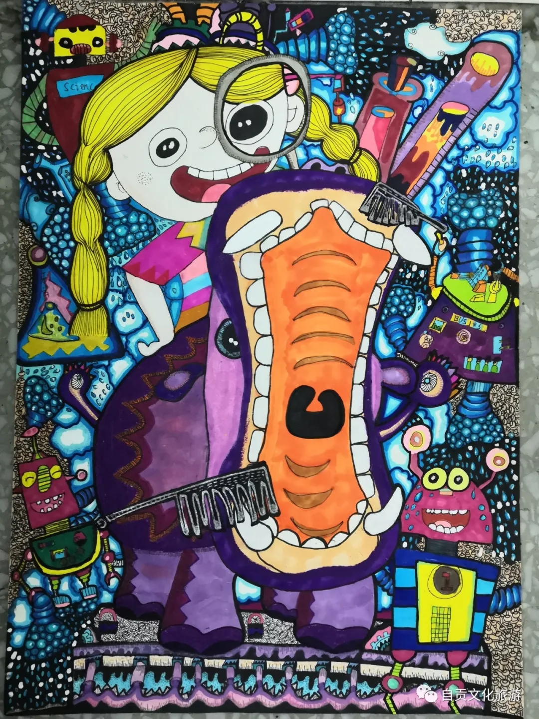 展出包括陈相汝的水粉画《当旧物遇见艺术》、梁顺鑫的儿童画《机器人勇士》、朱佳妮的线描《青花瓷》、王可馨的黑白儿童画《猪八戒吃西瓜》、黄文博的彩笔画《河马牙刷机》等100幅作品。观展时间为周一至周五上午10:00—11:30,下午15:00—17:30。(图文由自贡文旅局提供) |