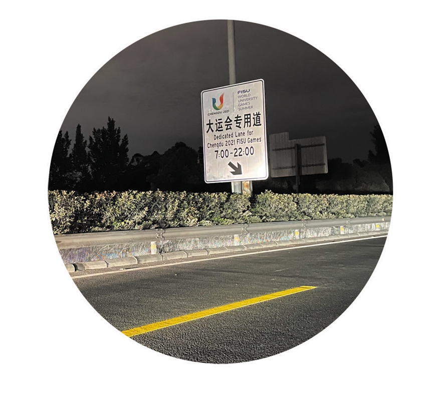 记者看到,在道路中央隔离带设有专门的提示牌提醒,通行时间为7∶00—22∶00,车道上还印有大运会会徽,便于和其他车道区分。