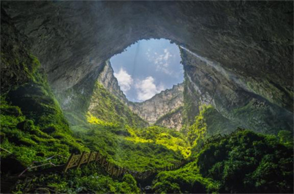 由上往下望去,天坑如“窗”,在东北方向峭壁上有小道通到坑底,坑底下边有地下河,小寨天坑是地下河的一个“天窗”。