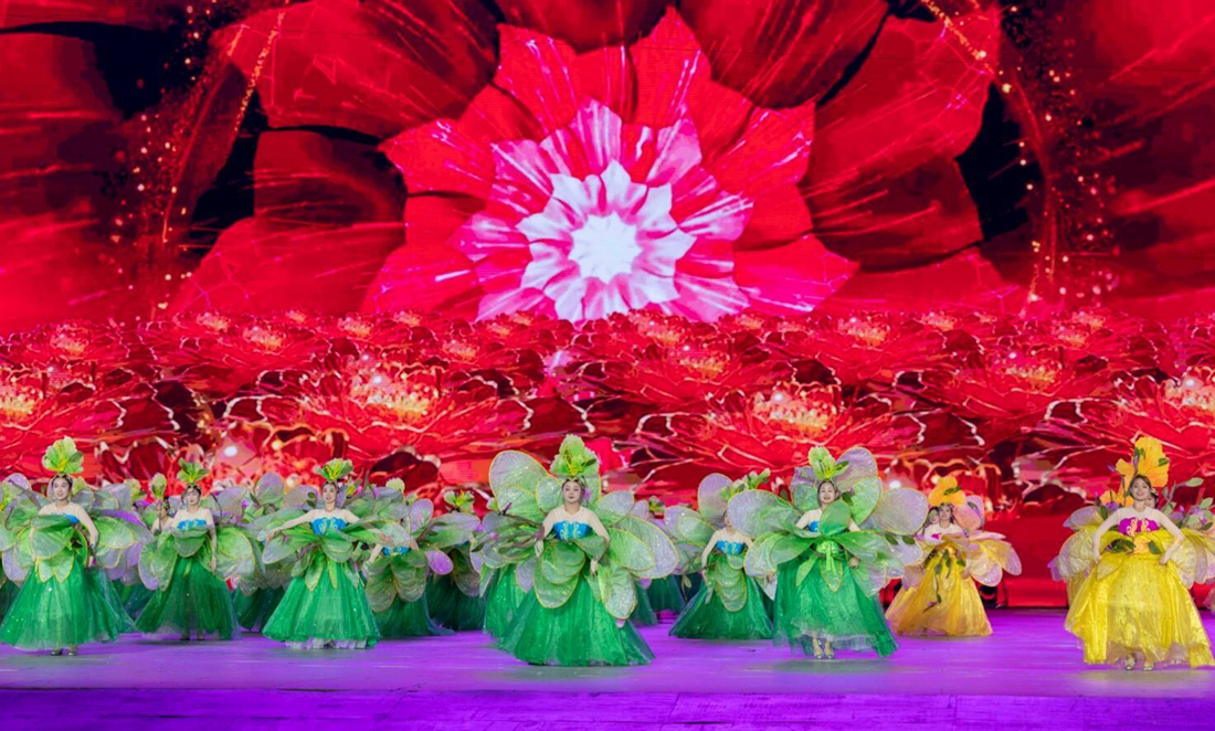 紧接着,代表21市州的演员轻舒云袖,曼妙登场。衣袖间花朵舞动,寓意着巴蜀大地是绿色生态的乐土、创新创业的乐土、幸福生活的乐土。