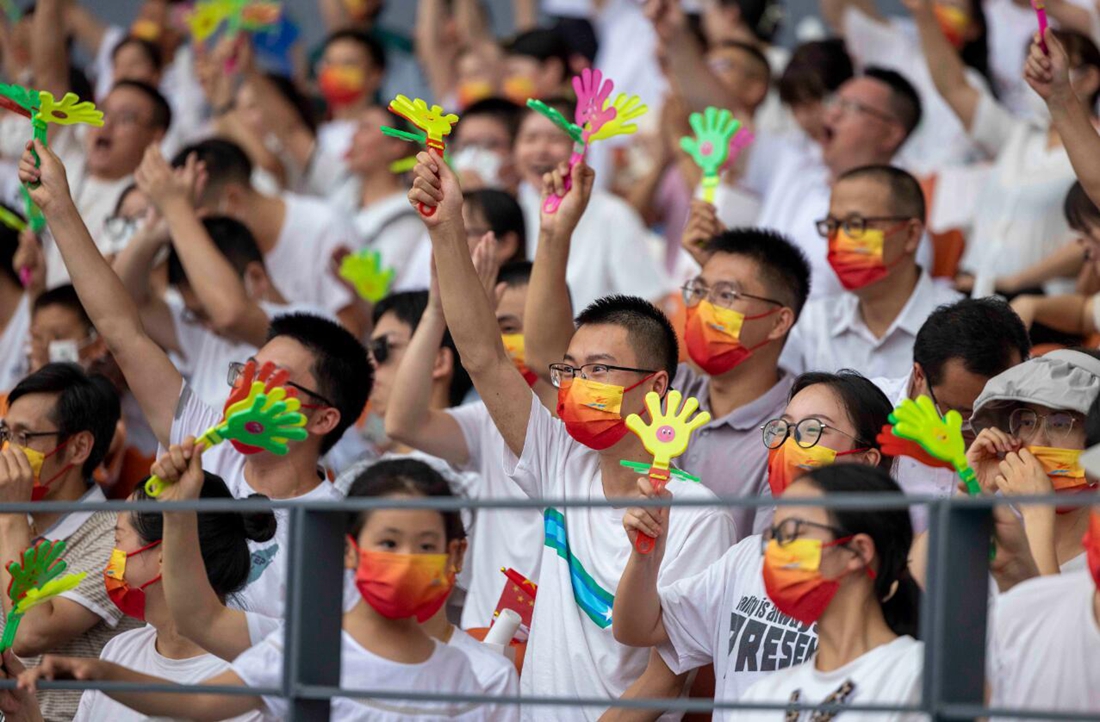 参加开幕式的观众为健儿加油。
