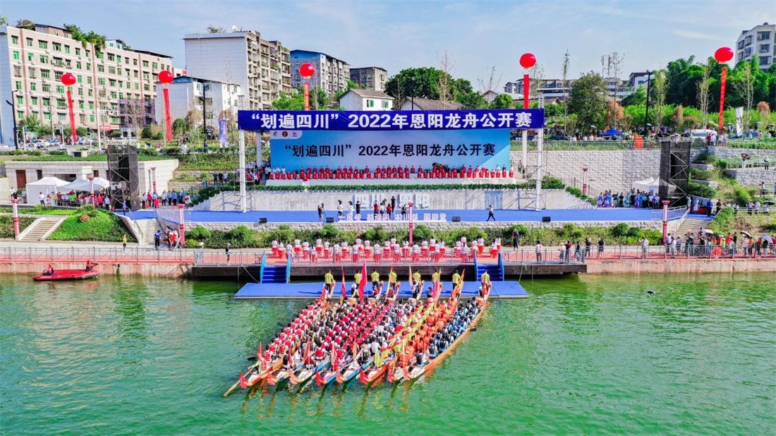 四川新闻网-首屏新闻成都8月11日讯(记者 张宇)恩阳河畔金鼓震,离弦之箭看龙飞!8月11日上午,以“水韵恩阳·盛世龙腾”为主题的“划遍四川”2022年恩阳龙舟公开赛在新落成的恩阳龙舟公园正式开幕。