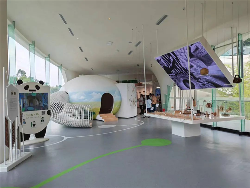 竹文化科普体验馆通过多元化的数字化模拟技术,大量运用声、光、电等科技设备向游客展现了示竹子的品类、习性、用途、生长特点等知识。让游客在光影变幻中了解竹子的成长过程,通过虚拟成像骑行在无根山间。