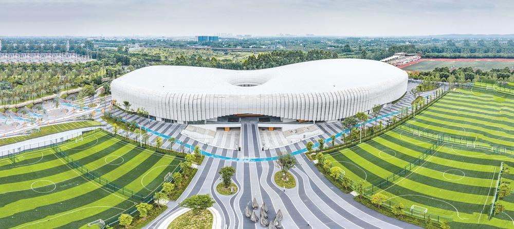 一座流畅弧形结构的白色建筑极具现代美学观感,近看,外墙如同篇篇书页一般;远看,柔美的曲线如同水中的荷叶;俯看,一座椭圆形“连体双馆”静静伫立。体育场馆设计采取碧水青莲的规划概念、万卷诗书的造型意向。这座造型前卫的体育场馆,将承接第31届世界大学生夏季运动会的水球预赛。27日,记者前往坐落于新都区兴乐北路的香城体育中心,探访这座“内外兼修”的大运场馆。