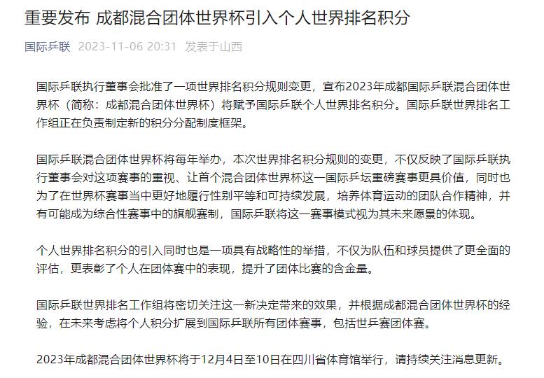 四川新闻网-首屏新闻成都11月6日讯 国际乒联6日发布消息,国际乒联执行董事会批准了一项世界排名积分规则变更,宣布2023年成都国际乒联混合团体世界杯(简称:成都混合团体世界杯)将赋予国际乒联个人世界排名积分。国际乒联世界排名工作组正在负责制定新的积分分配制度框架。